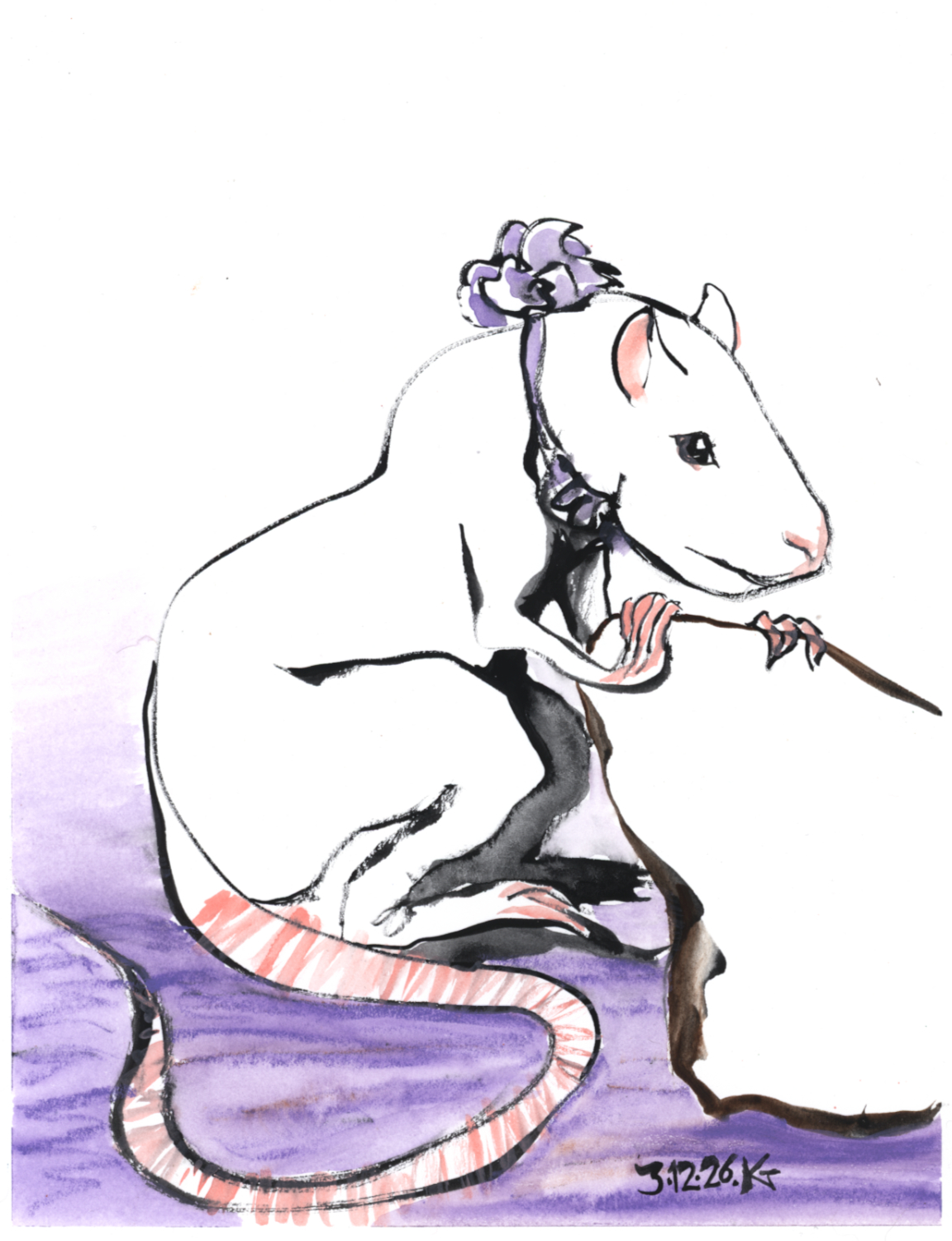 ALT: water-soluble crayon (caran d’ache). a creature that most nearly resembles a rat wears a lavender collar with a decorative flower on it, and timidly clutches something that could be a small rock or large piece of toast or cheese.