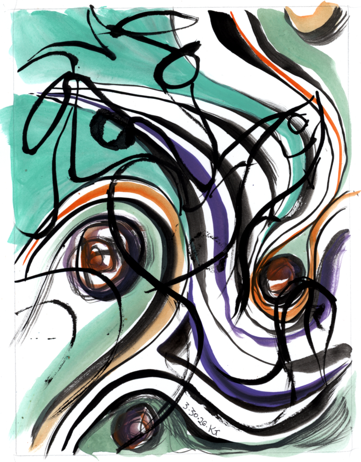 ALT: ink and water-soluble crayon. calligraphic doodles of a goat, fish, and bird float over a ground of watery swirls with lumps in it.