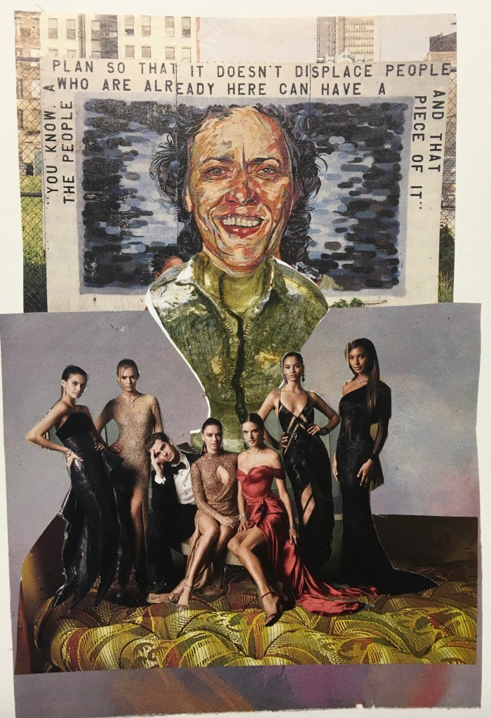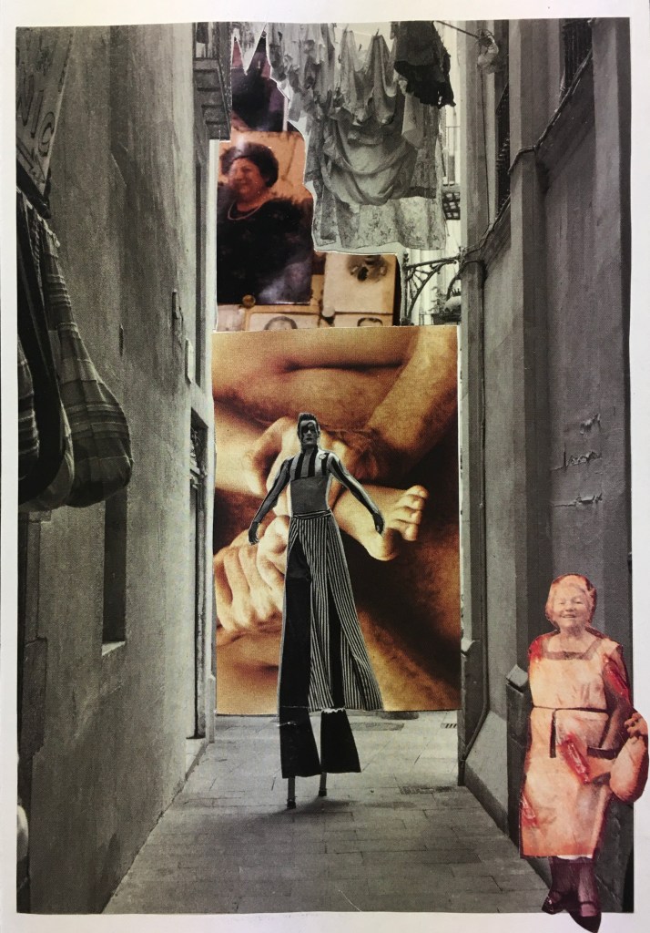 The two above are on 9″ x 12″ paper. I love how collage can engage playful intuition. I work on several at the same time, and think that I’m just responding to line and color, but then often find that they have drawn forth a little story or vignette.
