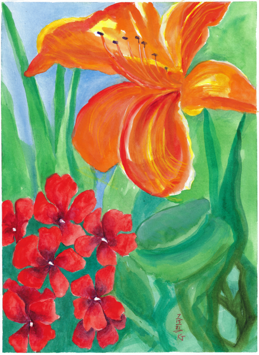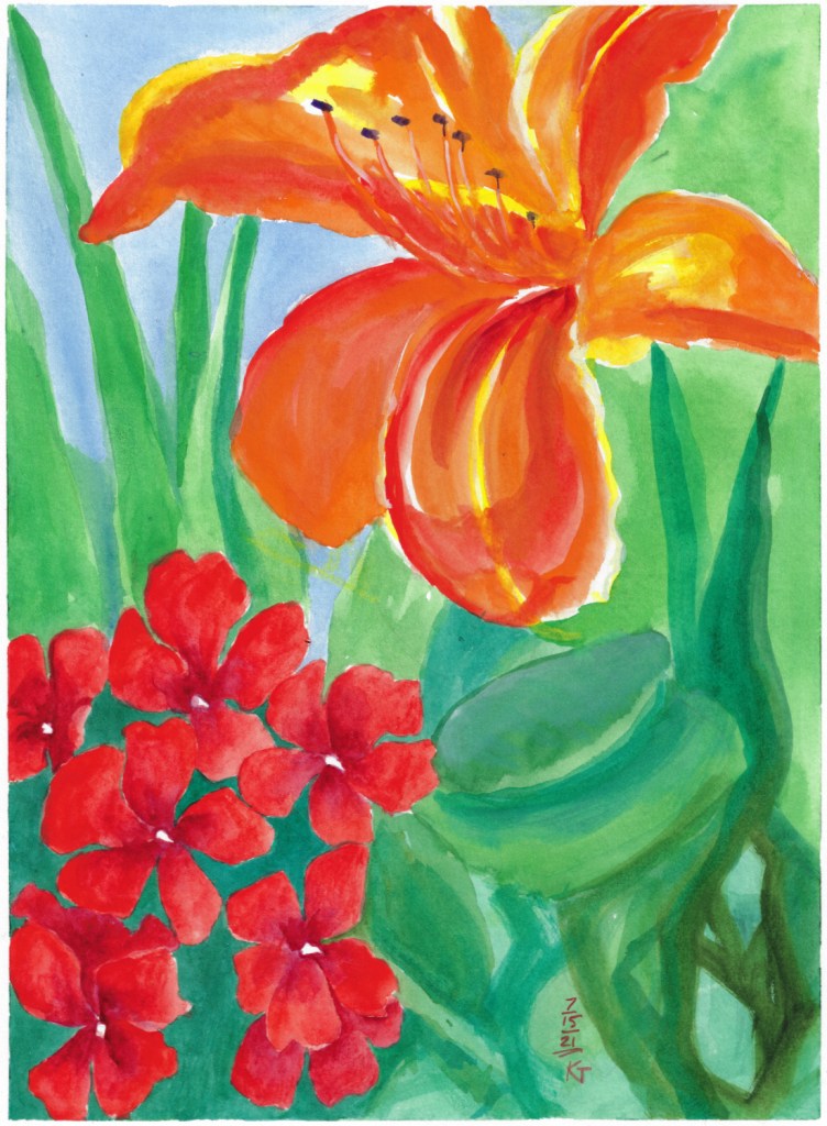 Honestly, I just wanted to paint something as red as the flowers I saw in a planter I saw while doing errands in town. I did not succeed (those flowers were really, truly, amazingly red) , but I don’t mind an excuse to paint more flowers.