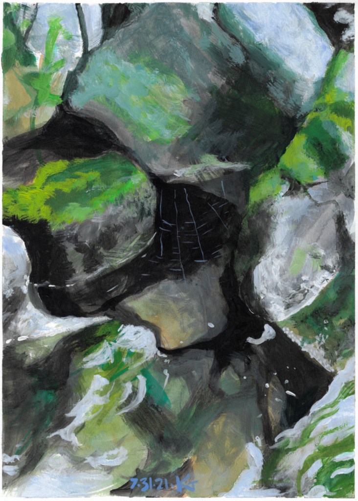 It was years ago in the summer vacation place, one of my aunties and I don’t remember if it was Harriet or Ann, set the challenge of painting rocks in water. I’ve made a few attempts at watercolors, and to be honest I’m always startled if they even somewhat work out.