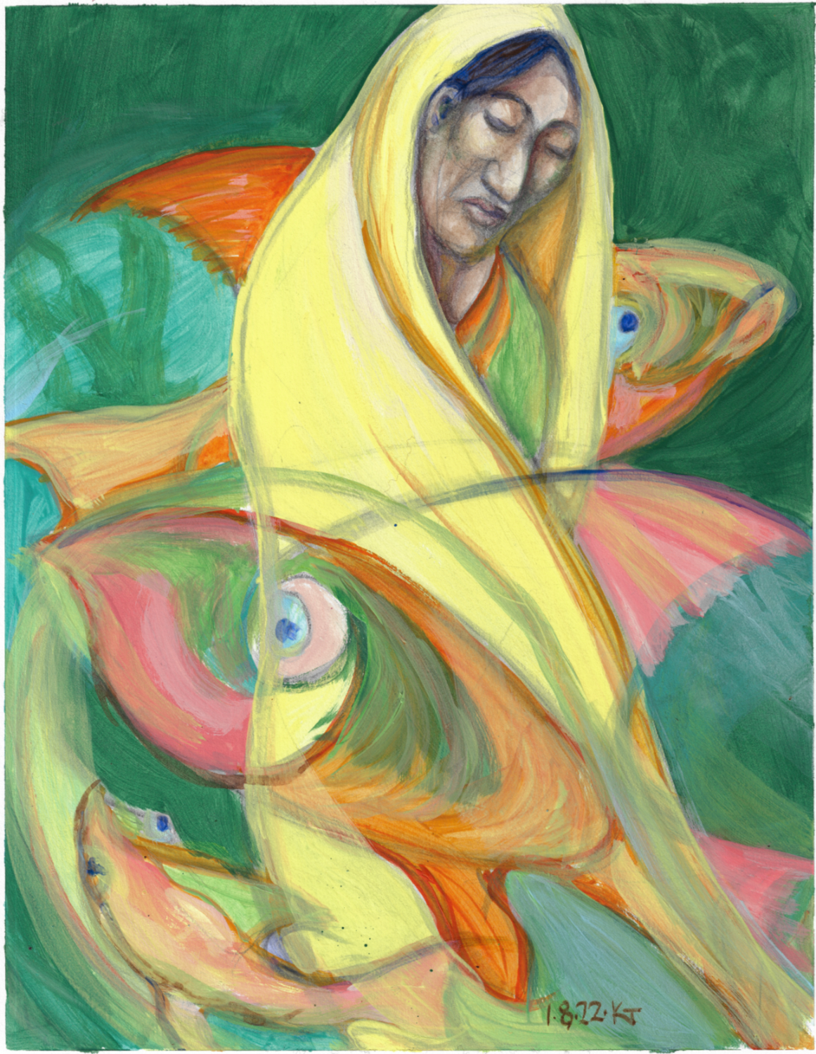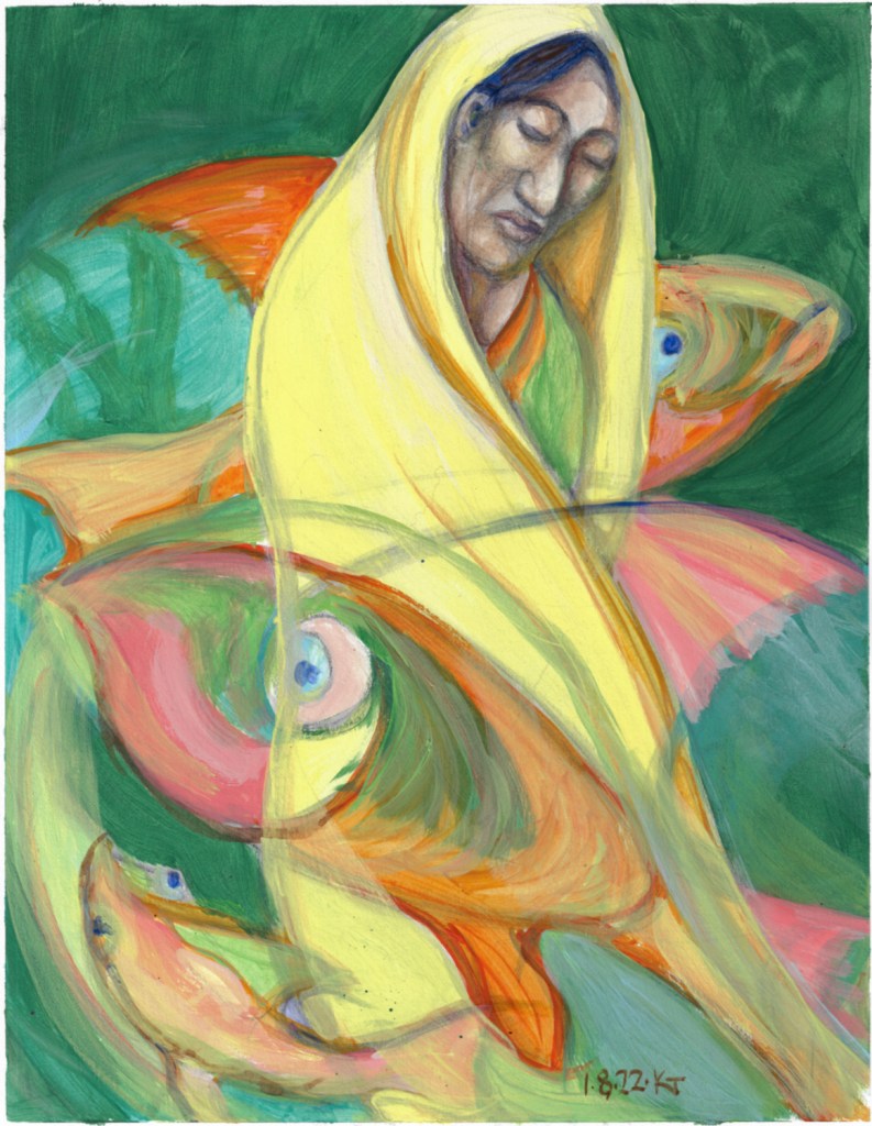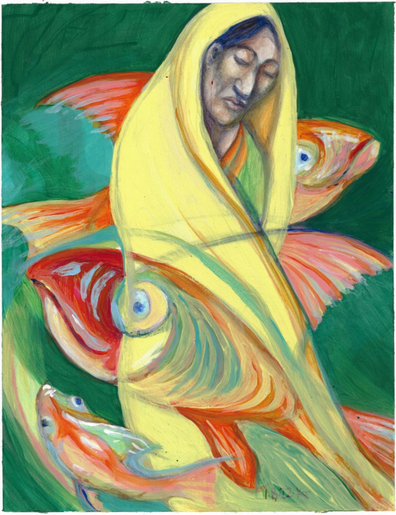 In the houses I grew up in, there were a few pieces of art on the walls that I spent a fair amount of time looking at. One had a young woman in a pale yellow sari. Another was a Klee print of a fish on a plate. I think they may have merged somewhere in my memory.