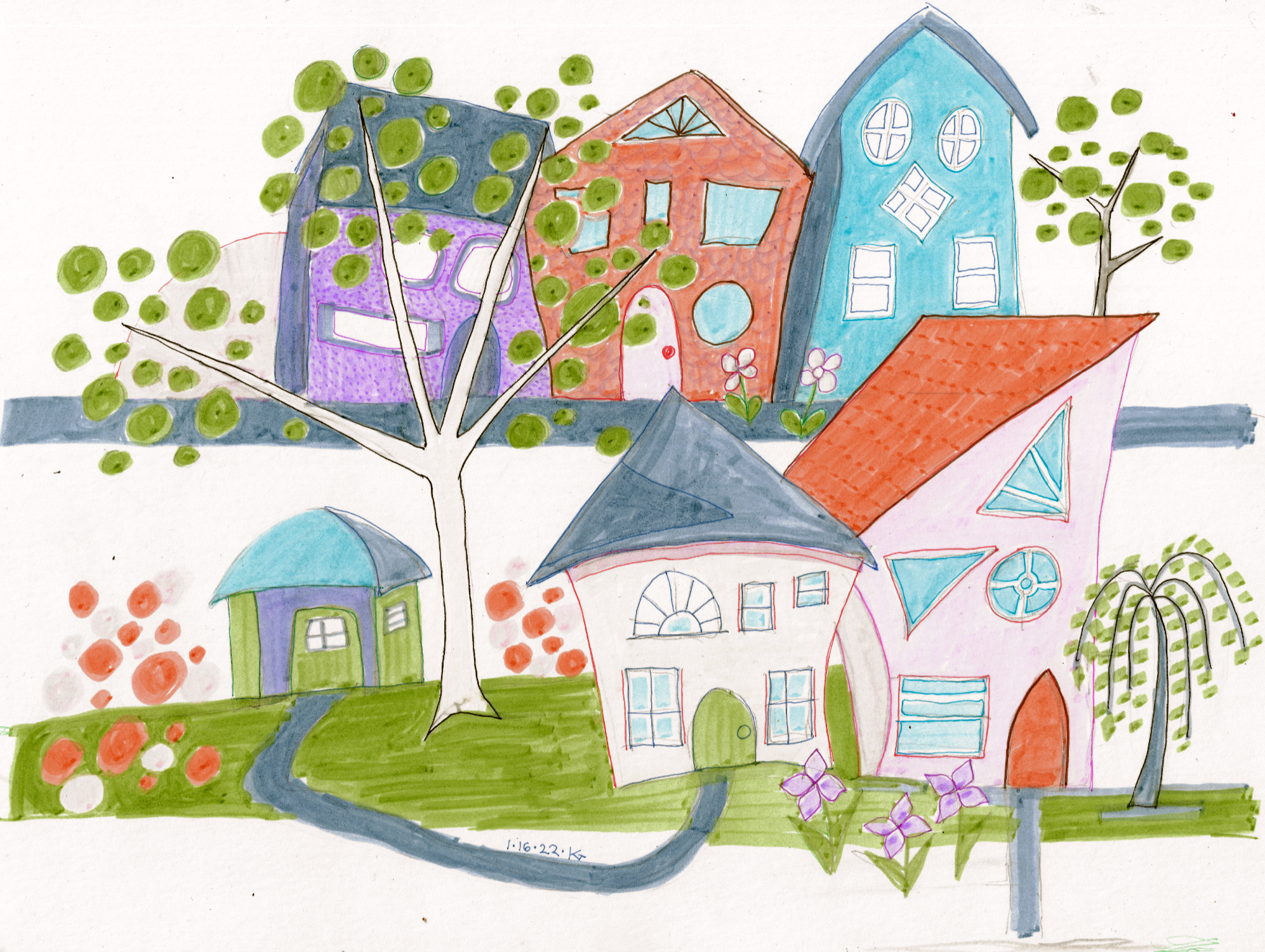 The scanner had a real problem with the colors of the highlighters I used, especially the pink and flourescent orange (which here looks like a pinkish beige). I had to tinker a bit with the levels, but still couldn’t get the balance right so you’ll just have to imagine the warm cheerfulness of the original!