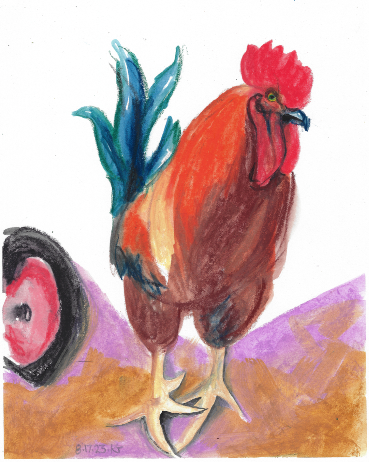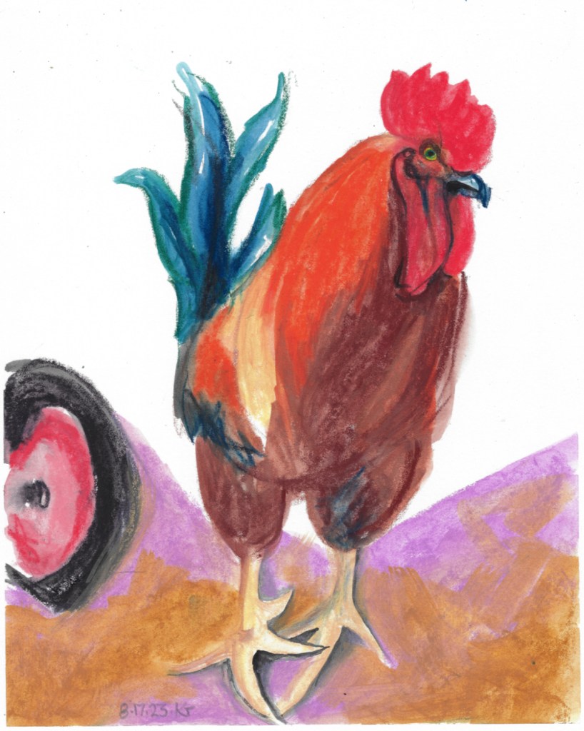 crayon/pencil, daily drawing, Original Art Available 17 August 2023 August 18, 2023 eyespider 1 Comment Here’s the mighty, handsome rooster of my sister’s flock. He supervises me carefully when I collect the eggs and check the water and feed. Share this: Click to share on Facebook (Opens in new window) Facebook Click to share on Bluesky (Opens in new window) Bluesky Click to email a link to a friend (Opens in new window) Email Like Loading... Related