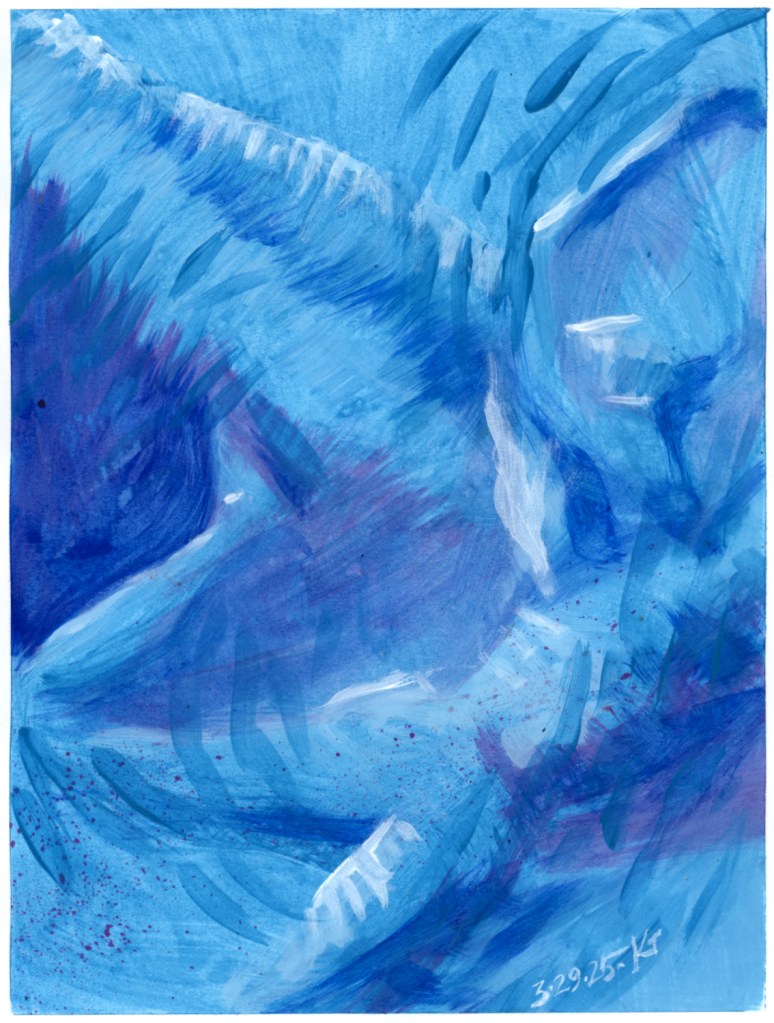 acrylic, daily drawing, Original Art Available 29 March 2025 March 30, 2025 eyespider 1 Comment icarus ALT: acrylic painting all in shades of blue, you can see a wing and a leg and some streaky stuff that might be the wind going past Share this: Click to share on Facebook (Opens in new window) Facebook Click to share on Bluesky (Opens in new window) Bluesky Click to email a link to a friend (Opens in new window) Email Like Loading... Related