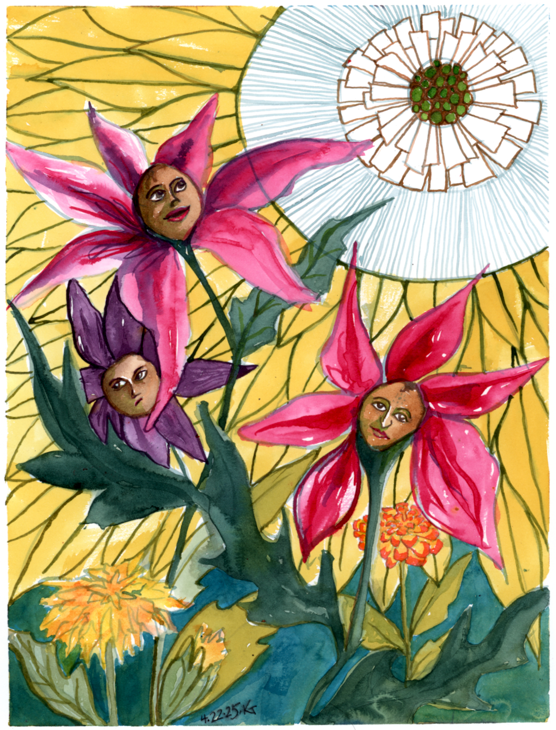 ALT: Same description as yesterday, but now the faces have color, the ground is greener, the dandelion and marigold are painted in, and some outlines tidied up. (yesterday’s description: ink painting of three flowers shaped sort of like daisies, but pink and purple, and having faces in their centers. The top one is smiling open-mouthed, just under is one that looks sort of skeptical, and the third stands apart looking a bit zoned out. Not yet colored in there’s a fairly normal looking dandelion and a marigold. The sky is filled with a sun that is really just another big flowers with petals that cover the whole background of the picture.)