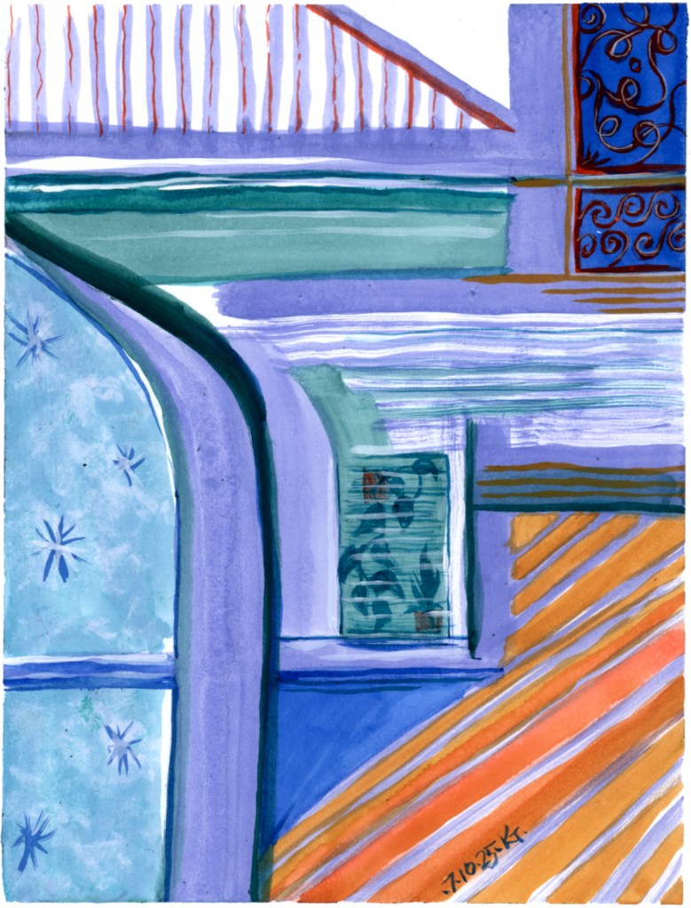 ALT: water soluble crayon and ink, in the colors of chicory and daylilies. It looks like windows in an apartment building, sort of. The middle window has some plants in it. There’s a big arched window on the left, that has little stars or sparkles in it, and another smaller one on the top right with what could be wrought iron fancywork.