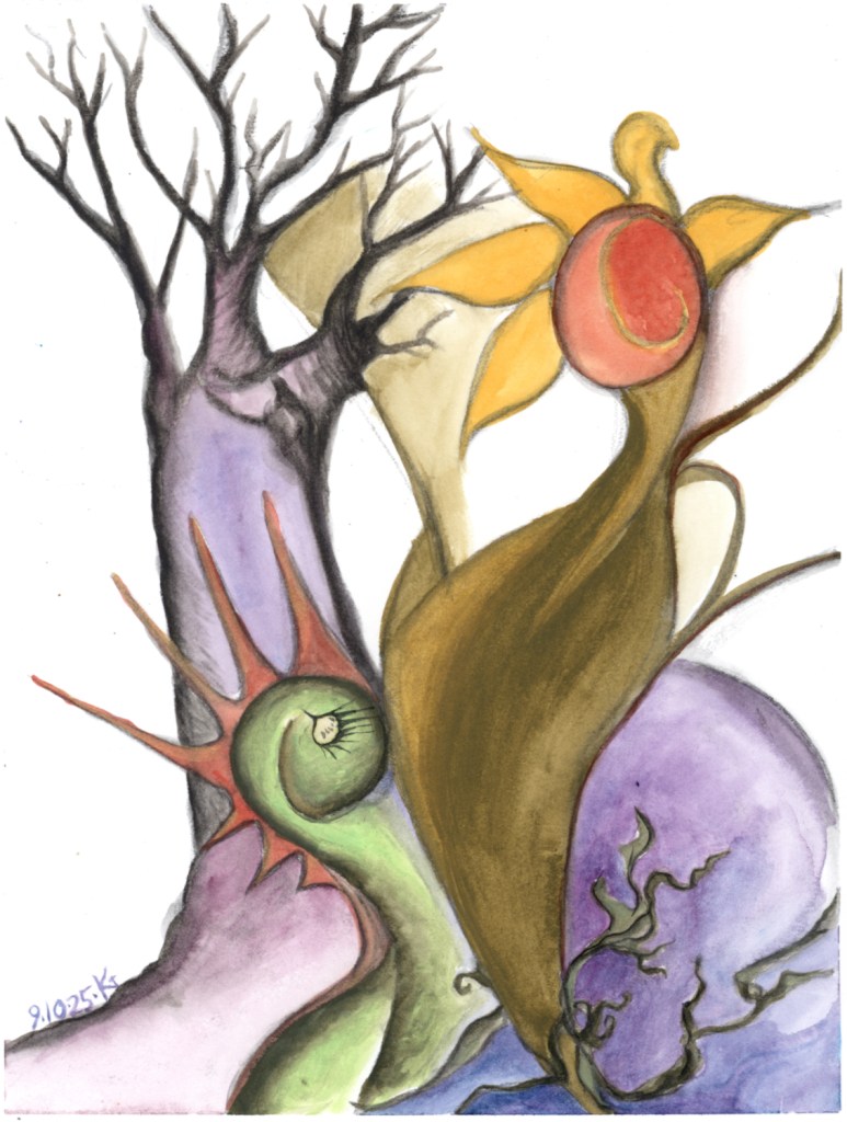 ALT: crayon drawing of a sunflower being, something like a friendly caterpillar being? and a tree with no leaves.