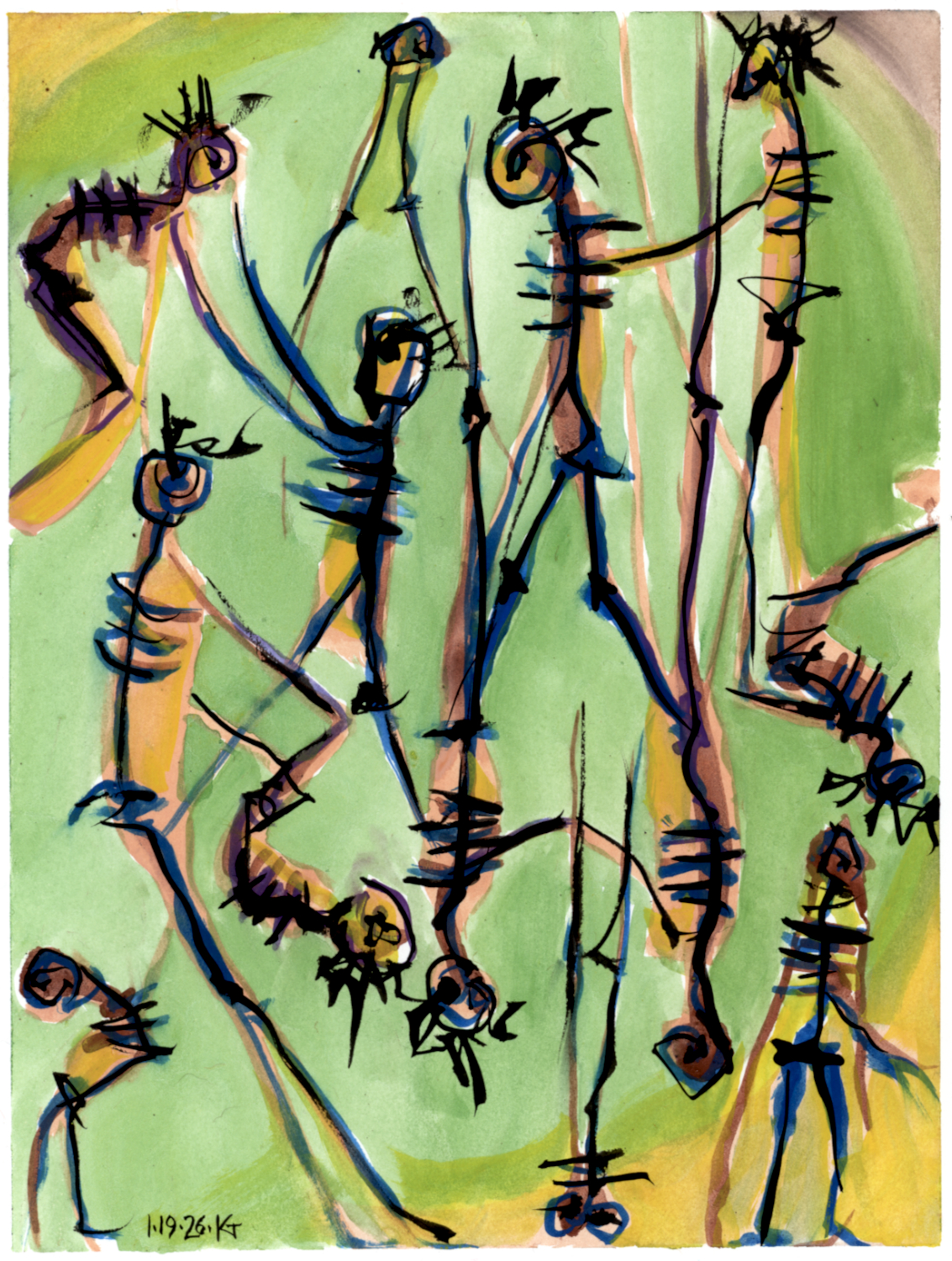 ALT: ink and water-soluble crayon, abstract calligraphic. it’s lots of people drawn as sort of stick figures, upside-down and upside-right (as my children used to say). they may be communicating, but it all looks pretty spiky and messy.