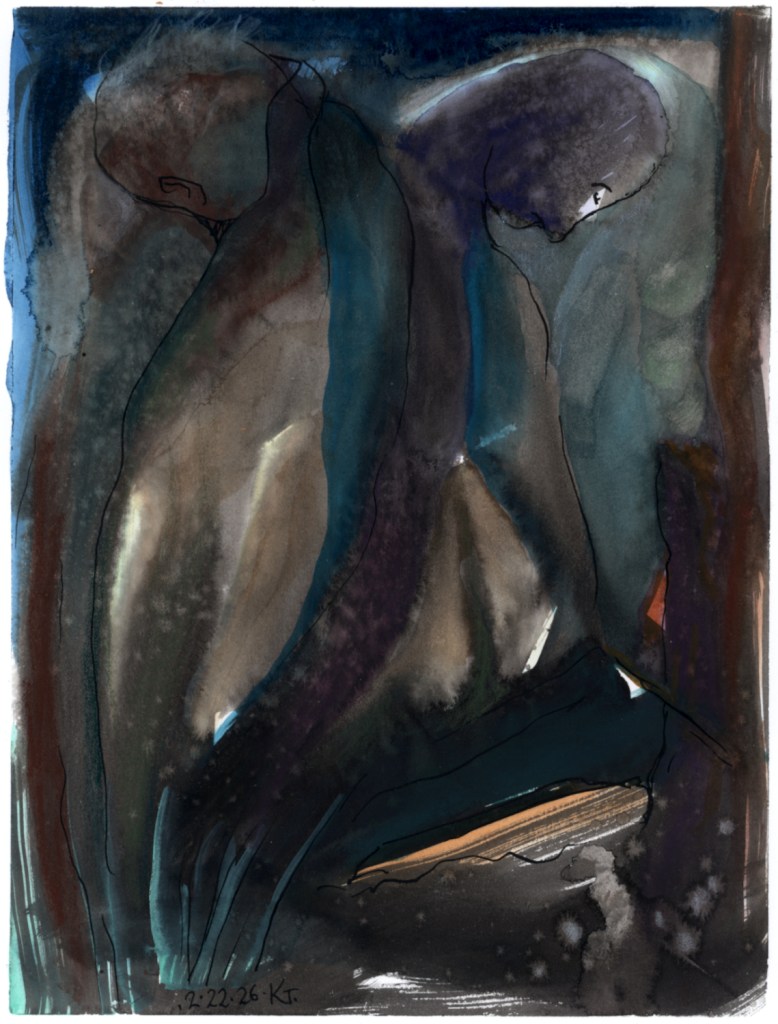 ALT: ink and water-soluble crayon. a dark ink-wash from which emerges two figures, back to back, looking downward and away from you. there might be a large book on the ground, and a scrap of something bright colored peeking out behind a wall or tree, but mostly the colors are very subdued greens and browns.