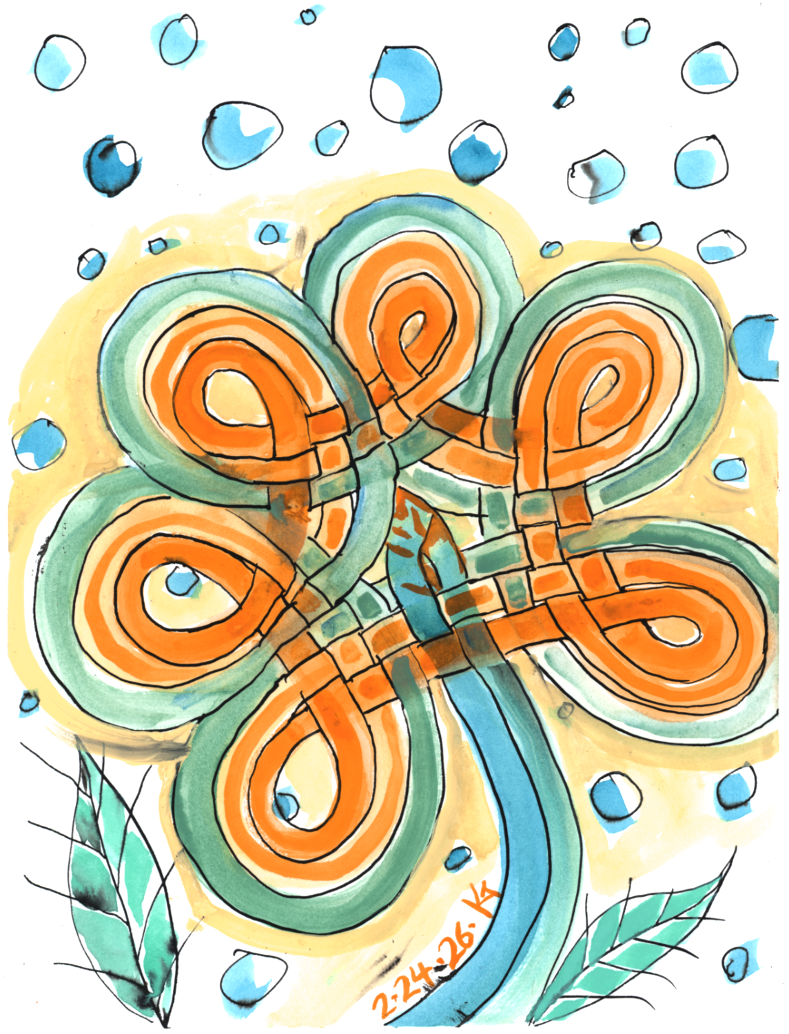 ALT: ink and water soluble crayon. a woven knotwork floral shape (not perfectly drawn!) covers the page, with a couple of leaves below it and surrounded by little blue circles that could represent snow falling. the flower is orange, with yellow glow around it.