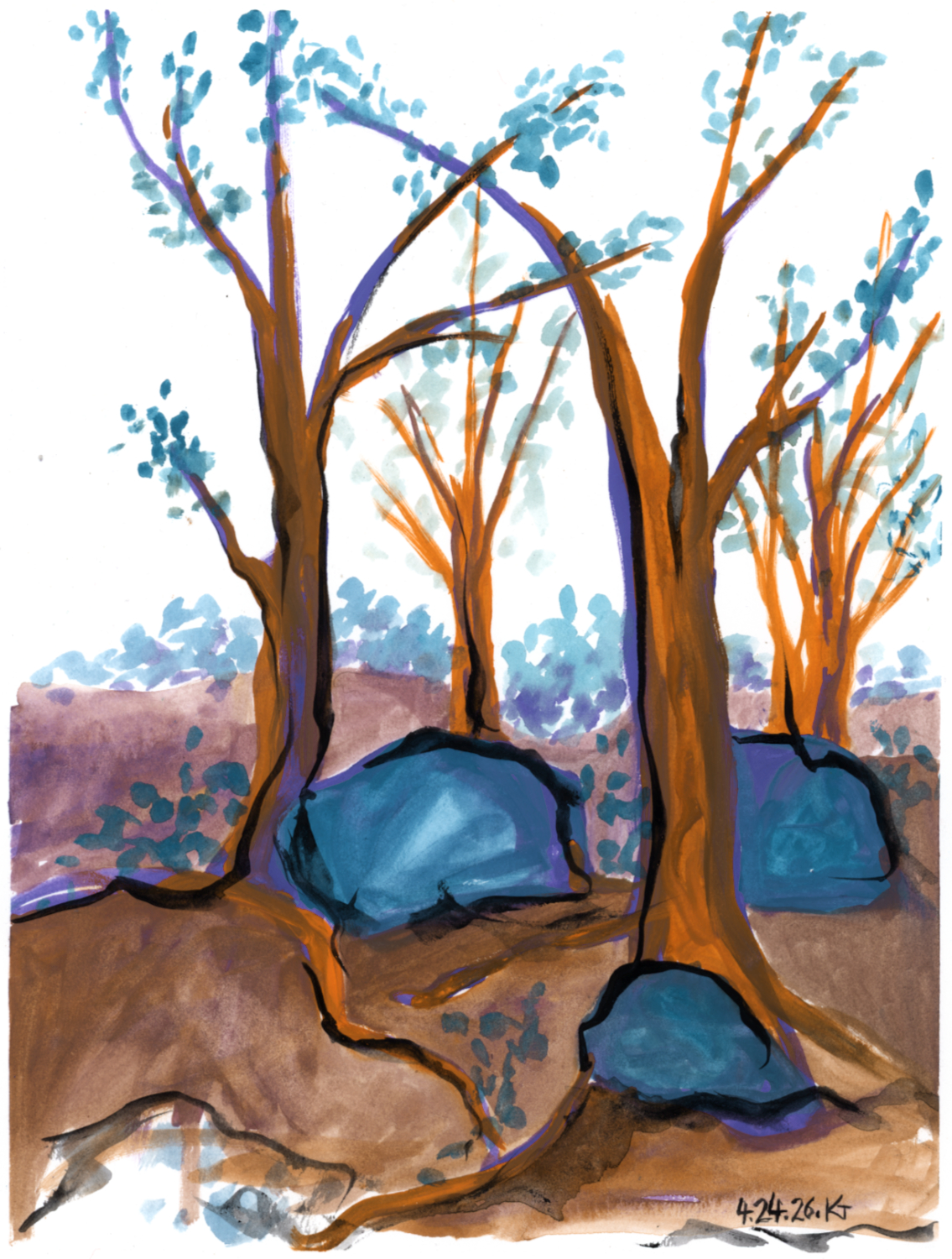 crayon/pencil, daily drawing, Original Art Available 24 April 2026 April 25, 2026 eyespider Leave a comment tree rocks ALT: water soluble crayon. four orangish trees stand straight in a forest, each with a blue rock at its base. well, you can’t really see if the one in the way back has a rock, because one of the rocks blocks the view of its base. Share this: Share on Facebook (Opens in new window) Facebook Share on Bluesky (Opens in new window) Bluesky Email a link to a friend (Opens in new window) Email Like Loading... Related