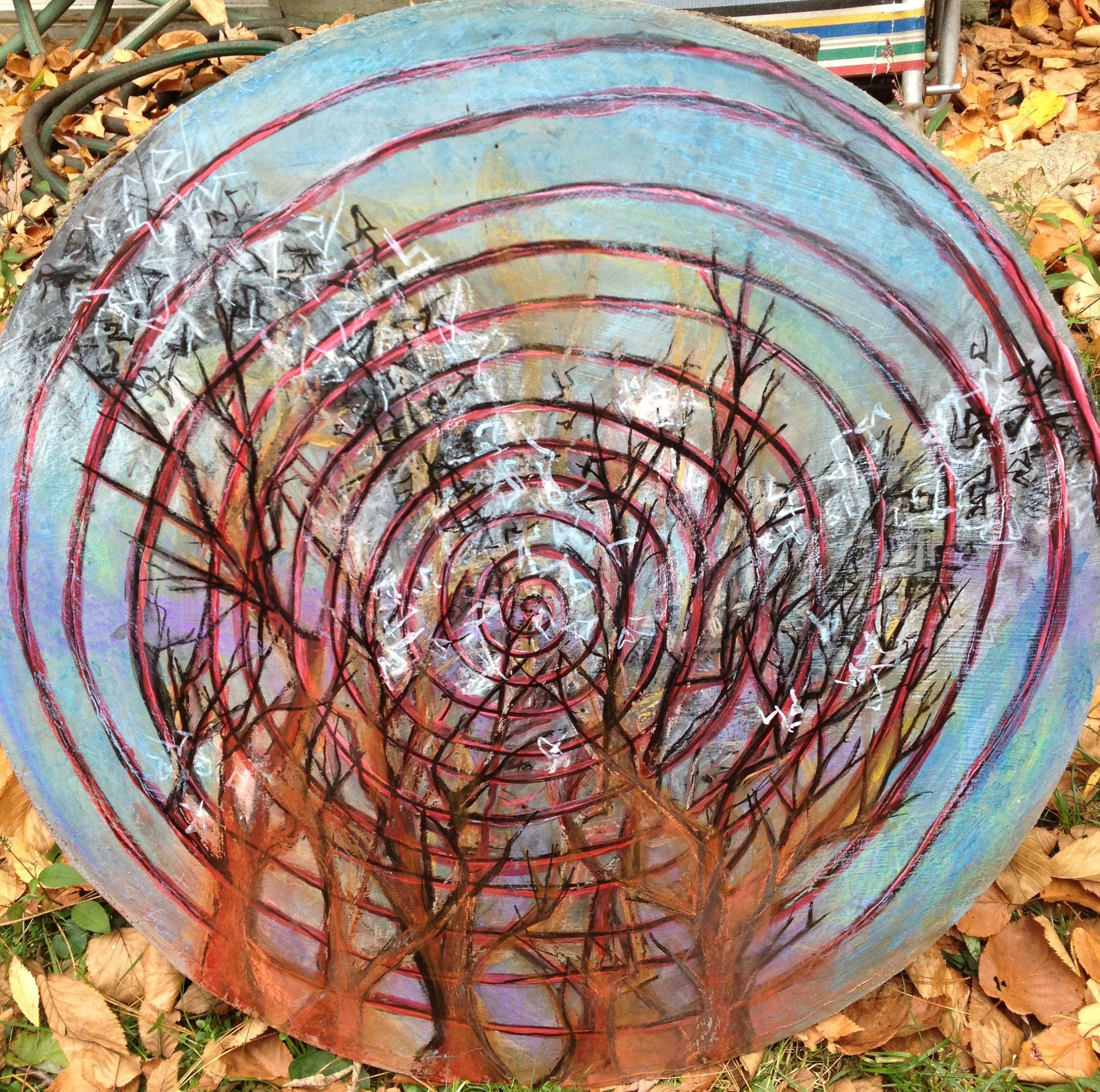 My usual media – ink, crayon, water soluble colors, wax – on masonite, not my usual surface. I don’t feel that it’s finished yet; as it progresses I’ll post it again.